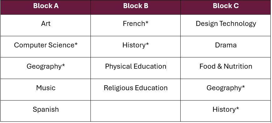 - 3 Optional Subjects—one from each option block (6 lessons per fortnight)